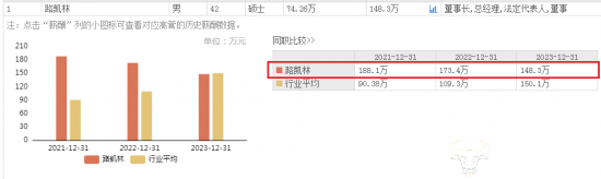 2021年路凯林的年薪为188.1万元,2022年降至173.4万,2023年继续下滑至148.3万元。去年降薪幅度较大,降了25.1万元。