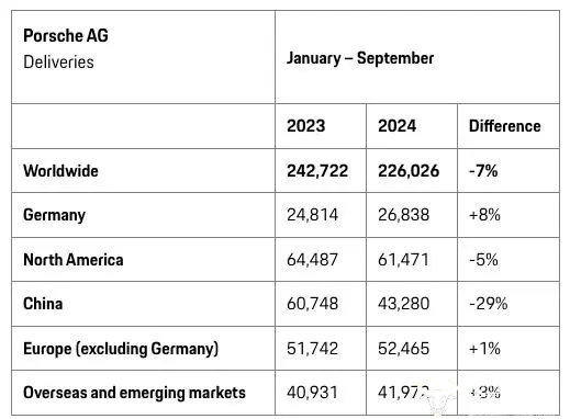 据保时捷官方发布的销量数据显示,2024年前三季度,保时捷全球销量为226,026辆,与去年同期的242,722辆相比,同比下滑7%。保时捷官方称,中国销售疲软以及正在进行的车型改造拖累了整体业绩。