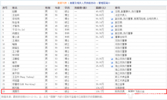 2010年1月,周厚杰开始担任中国人保的财务负责人、首席财务执行官,至今已有14年。据东方财富网公布的高管薪酬可知,2023年其薪酬达到了130.7万元,在中国人保高管中薪酬仅低于总裁助理韩可胜的134.6万元。