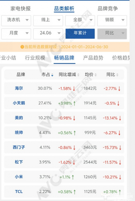 与此同时,各知名厂家实行低价战略,以价换量。奥维云网数据显示,上半年海尔、小天鹅、美的、统帅、西门子、松下、小米等行业主力品牌的均价都在下滑,其中美的、西门子、松下、小米的下滑幅度达到了两位数。