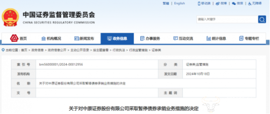 10月18日,中国证监会发布关于对中原证券股份有限公司采取暂停债券承销业务措施的决定,暂停业务时间为6个月。