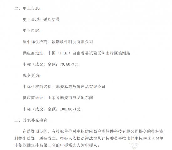 根据公告,是因为有人投诉了浪潮科技,公告称,在质疑期期间,有投标单位对中标供应商浪潮软件科技有限公司提交的投标资料提出质疑,质疑成立。招标人依据法律法规从评标委员会推出的中标候选人名单中依次确定排名第二名的中标候选人为中标人。
