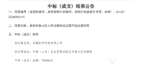 据悉,该项目是泰安市泰山区某单位发起的平台升级改造项目,项目预算金额为109.68万元,项目于2024年9月初发布招标公告,9月25日,中标结果公布,浪潮软件科技有限公司以79.8万元的报价成功中标。