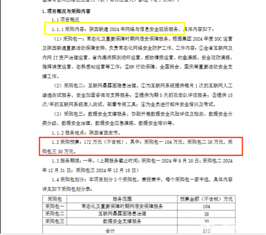 这个项目采购内容是陕西联通2024年网络与信息安全现场服务,划分为三个采购包,采购包一是常态化及重要保障时期网信安保障服务,预算104万元;采购包二是互联网暴露面隐患治理,预算38万元;采购包三是数据安全支撑服务,预算30万元。三个采购包合计预算是172万元,规模不大。