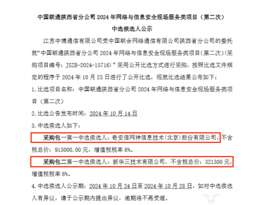 根据中选候选人公示,采购包一第一中标选候选人是奇安信,不含税总价为91.3万元;采购包二第一中选候选人是新华三,不含税总价是32.13万元。