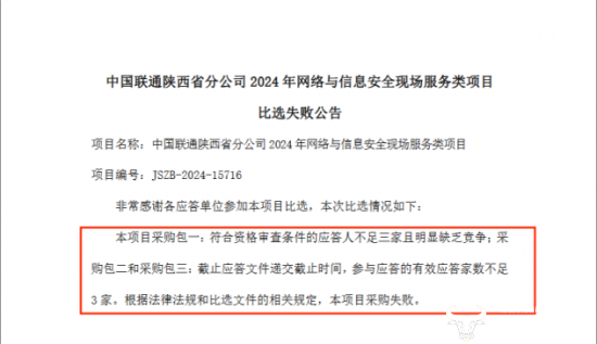 9月29日,陕西联通第一次发布比选公告,不久,就因为符合资格审查条件的应答人不足三家且明显缺乏竞争、截止应答文件递交截止时间,参与应答的有效应答家数不足3家等原因采购失败。