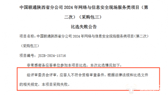 10月14日,陕西联通发布第二次比选公告,十天后,采购包三再次比选失败,原因是应答人不符合资格审查条件。