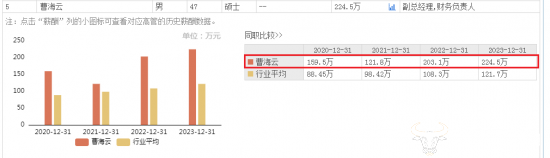 值得一提的是,根据东方财富网显示,曹海云去年的薪酬为224.5万,已连续两年涨薪。2021年、2022年的薪酬分别为121.8万、203.1万。