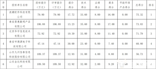 根据公告中的中标候选人名单,浪潮软件以75.32的总得分排名第一。但是浪潮软件其实不是报价最低的,排名第四的泰安市德源电子科技有限公司的投标报价只有47.14万,折扣率为42.97%,这个折扣率相当低了。不过该公司只排在第四名,虽然价格低竞争力会相对提高,但这个项目显然卷价格的作用没那么大。