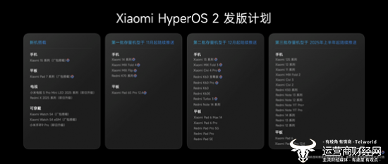 10月29日,小米于北京召开主题为「新起点」的Xiaomi 15系列 暨小米澎湃OS 2新品发布会,正式发布小米澎湃OS 2,它是小米迈向AI全生态的坚实一步,是以人为中心,AI全面赋能的「人车家全生态」操作系统。小米澎湃OS 2带来三项核心技术革新——HyperCore、HyperConnect、HyperAI,在基础体验、跨端智联和AI体验上为全球用户带来焕然一新的先进体验。小米澎湃OS 2将搭载于本次发布的Xiaomi 15系列、Xiaomi Pad 7 系列、Xiaomi Watch S4等产品,并将从2024年11月开始陆续向更多机型推送正式版。