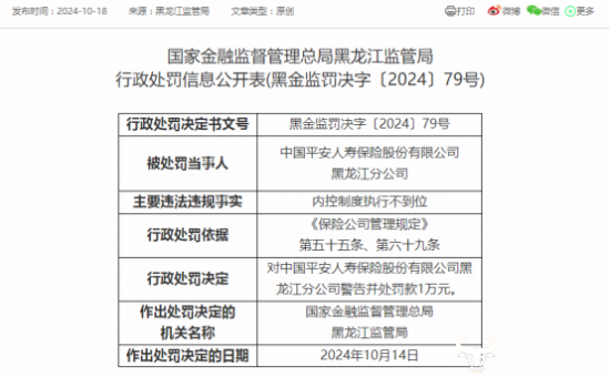 10月18日,黑龙江监管局发布的行政处罚信息公开表显示,平安人寿黑龙江分公司因内控制度执行不到位,被警告并处罚款1万元。