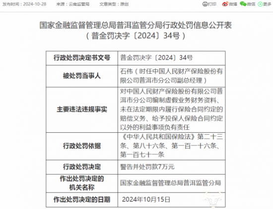 此后,在10月28日,云南监管局发布对时任普洱市分公司副总经理石伟的处罚信息,其因对公司编制虚假业务财务资料、未在法定期限内履行保险合同约定的赔偿义务、给予投保人保险合同约定以外的利益事项负有责任,被警告并处罚款7万元。石伟现在是普洱市分公司负责人。