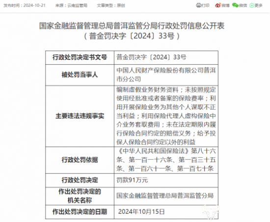 日前,中国人民财产保险股份有限公司普洱市分公司因六项违法违规事实被普洱监管分局罚款91万元,引发关注。运营商财经网试图探究其此次被罚的具体情况。