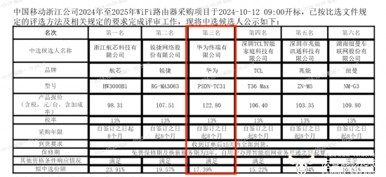 第三中标候选人为华为终端有限公司,产品报价为含税122.80元/台,拟中选份额为17.39%;