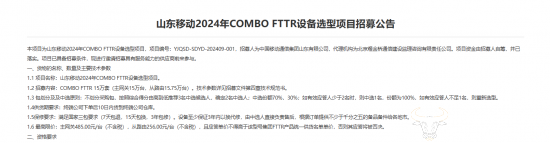 9月14日,中国移动采购与招标网发布“山东移动2024年COMBO FTTR设备选型项目招募公告”,项目内容是招募15万套COMBO FTTR设备,包括15万台主网关和15.75万台从路由。