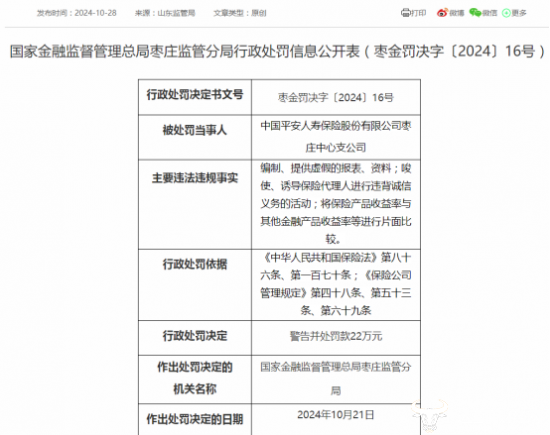 10月28日,山东监管局发布的行政处罚信息公开表显示,平安人寿枣庄中心支公司被警告并处罚款22万元。其存在三项主要违法违规事实包括:编制、提供虚假的报表、资料;唆使、诱导保险代理人进行违背诚信义务的活动;将保险产品收益率与其他金融产品收益率等进行片面比较。