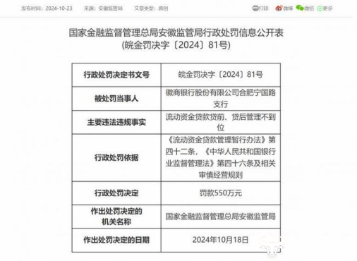 10月23日,据金融监管总局安徽监管局披露的信息显示,徽商银行合肥宁国路支行因多项违规行为,于10月18日被安徽监管局罚款550万元。该行主要违法事实为流动资金贷款贷前、贷后管理不到位。