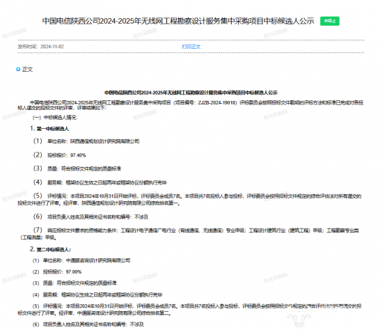 11月2日,“中国电信陕西公司2024-2025年无线网工程勘察设计服务集中采购项目”中标候选人公示。该项目预估项目规模为1.378亿元(含税),这意味着仅在11月初,陕西电信就接连发布两个上亿标的的项目。