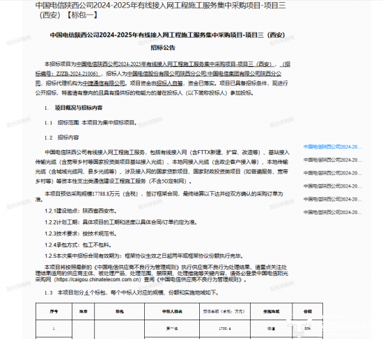 近日,陕西电信发布“2024-2025有线接入网工程施工服务集中采购项目-项目三(西安)”招标公告,该项目预算十几亿元,具体是什么情况呢?