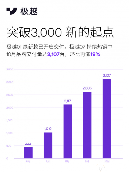 自上市以来,极越品牌展现了不俗的市场反响,在市场中的认可度和竞争力不断提升。今年5月份,极越品牌的交付量首次突破1000辆,随后其销量不断拔高。官方数据显示,2024年7月份至10月份,极越品牌的销量分别为1019辆、2117辆、2605辆、3107辆。