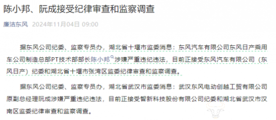 近日,“廉洁东风”公众号对外发布消息称,东风汽车有限公司东风日产乘用车公司制造总部PT技术部部长陈小邦涉嫌严重违纪违法,目前正在接受相关部门的调查,该消息引起了广泛的关注。那么,陈小邦是为何被查呢?
