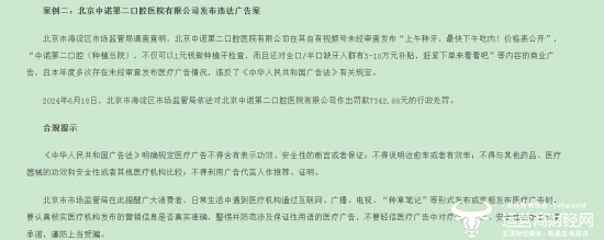 今年9月9日,北京市市场监督管理局也曾发文,表示北京中诺口腔医院因存在对口腔种植服务作虚假的、引人误解的商业宣传,欺骗、误导消费者等行为,被其于7月29日罚款35万元并警告。