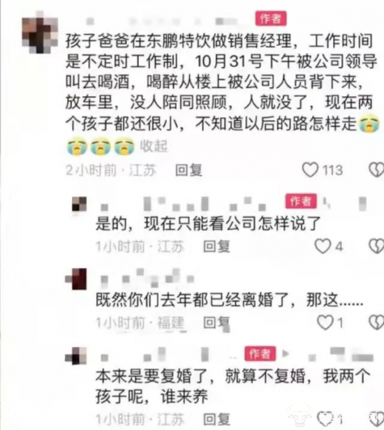 据了解,在11月4日,有网友发布视频称,自己的前夫在东鹏特饮做销售经理,工作时间是不定时制。10月31日下午他被公司领导叫出去喝酒,醉酒后被公司人员背下楼放到车里,没人陪同照顾,人就没了。