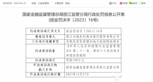 值得一提的是,今年6月,国家金融监督管理总局丽江监管分局行政处罚信息公开表显示,丽江古城农商银行曾因违规发放贷款增加地方政府隐性债务,被罚款100万元。同时,时任丽江古城农村商业银行行长杨静、营业部经理和永伟被警告。
