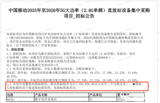 “2025年至2026年5G大功率(2.6G单频)直放站设备集中采购项目”只有一个标包,采购内容是35310台数字光纤直放站,最高投标限价约1.78亿元(不含税)