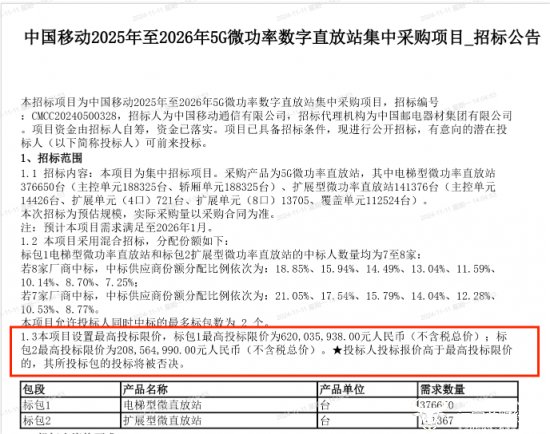 “2025年至2026年5G微功率数字直放站集中采购项目”也划分为两个标包,标包1采购内容是376650台电梯型微直放站,最高投标限价约6.2亿元(不含税);标包2采购内容是141367台扩展型微直放站,最高投标限价约2.09亿元(不含税)