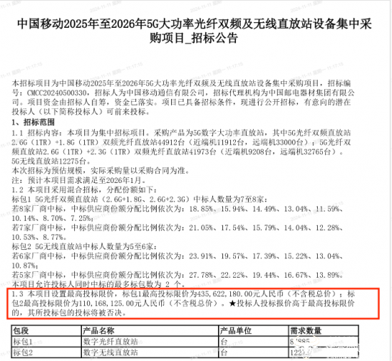 具体来看,“2025年至2026年5G大功率光纤双频及无线直放站设备集中采购项目”划分为两个标包,标包1采购内容是86885台数字光纤直放站,最高投标限价约4.36亿元(不含税);标包2采购内容是12275台数字无线直放站,最高投标限价约1.1亿元(不含税)