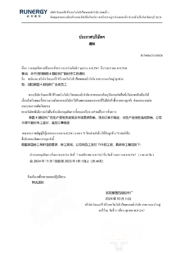 不仅如此,有相关人士称,润阳泰国电池片工厂近日也宣布从11月9日-11月30日放假,复工时间以公司通知为准。