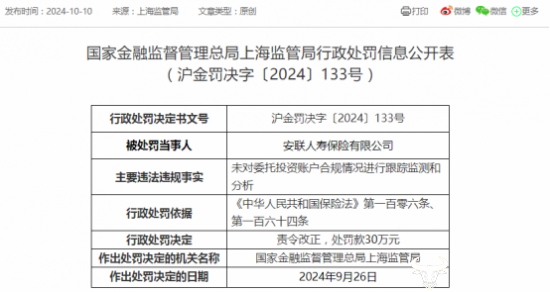 10月10日,上海监管局发布的行政处罚信息公开表显示,安联人寿存在未对委托投资账户合规情况进行跟踪监测和分析的违法违规行为,被责令改正并处罚款30万元。