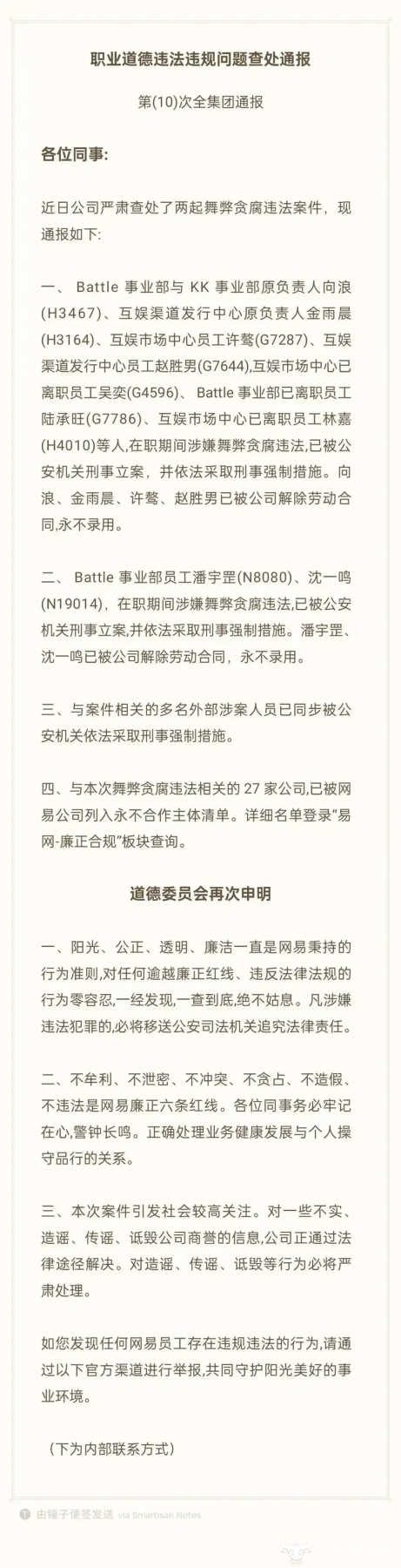 根据网易下发的内部邮件,Battle事业部与KK事业部原负责人向某、互娱渠道发行中心原负责人金某、互娱市场中心员工许某、互娱渠道发行中心员工赵某,互娱市场中心已离职员工吴某、Battle事业部已离职员工陆某、互娱市场中心已离职员工林某等人,在职期间涉嫌舞弊贪腐违法,已被公安机关刑事立案,并依法采取刑事强制措施。上述在职人员已被公司解除劳动合同,永不录用。
