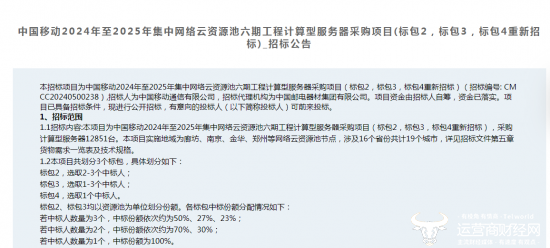 9月3日,中国移动发布了2024年至2025年集中网络云资源池六期工程计算型服务器采购项目的招标公告。