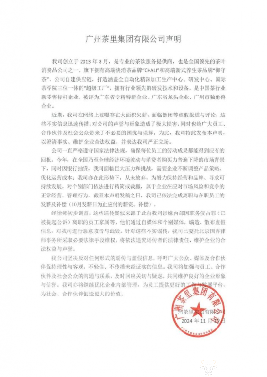 在爆料贴发布后,此事引发了极大关注。针对此次舆论风波,茶里集团在11月13日发布声明进行了回应。其表示截止声明发稿之日,公司已依法完成离职与在职员工的发薪及补偿(10月发薪日为止应付的薪资、补偿)。