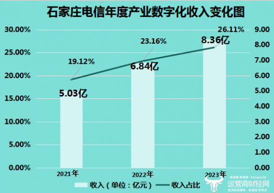 在2023年度,石家庄电信政企业务收入为8.36亿元,占总营收比重为26.11%。