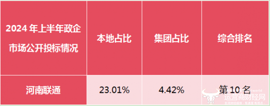 数据显示,河南联通在当地运营商中的投标规模占比为23.01%。这就意味着,河南联通并未超过当地平均水平,也就是25%,显然不可能排到当地运营商第一。