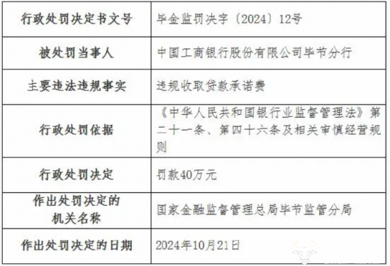 值得一提的是,近期工行毕节分行因违规收取贷款承诺费被国家金融监督管理总局毕节监管分局罚款40万元。与此同时,时任毕节分行公司金融业务部副总经理周玲受到警告,作出处罚决定的日期是10月21日。