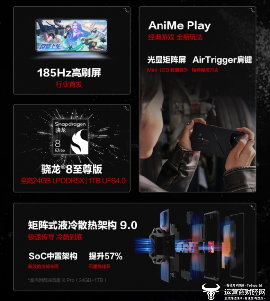 骁龙8至尊版想要保持最 佳性能释放状态,自然离不开强大的散热模组辅佐。ROG 9系列此次配备全新的矩阵式液冷散热架构9.0,结构上采用SoC中置五段式架构设计,有效保证玩家手持部位清爽舒适,内部在延续氮化硼+导热铜柱的基础上,加入超大石墨烯材质,体积提升57%,能快速将SoC发出的热量传导至整个背面,避免热量堆积,即使是长时间游玩高画质游戏也能做到时刻满帧。