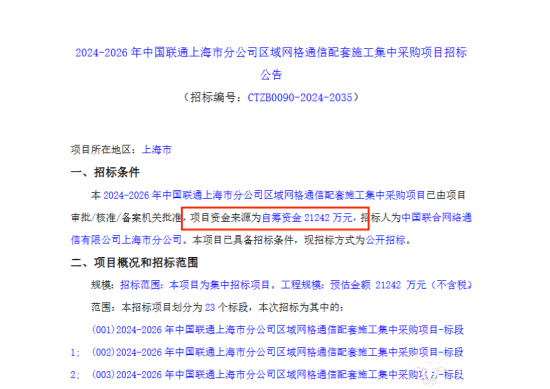 先来看一下项目的具体情况。9月30日,上海联通发布“2024-2026年区域网格通信配套施工集中采购项目”招标公告,项目划分为23个标段,不接受联合体投标,总预算约2.12亿元,标的很大。