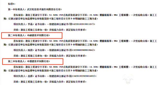 如标段6中排名第三的中徽建技术有限公司,标段7中排名第二的中通服建设有限公司,标段10中排名第三的中时讯通信建设有限公司,标段18中排名第二的中邮科通信技术股份有限公司等。
