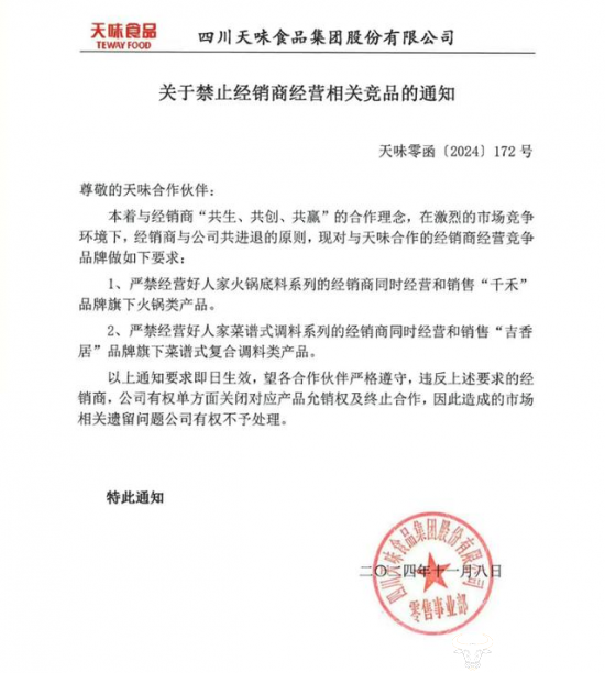据了解,近日天味食品被传向自己的经销商发布通知,要求严禁经营好人家火锅底料系列的经销商同时经营和销售“千禾”品牌旗下火锅类产品,同时还严禁经营好人家菜谱式调料系列的经销商同时经营和销售“吉香居”品牌旗下菜谱式复合调料类产品。对于违反者,公司有权单方面关闭对应产品允销权及终止合作。