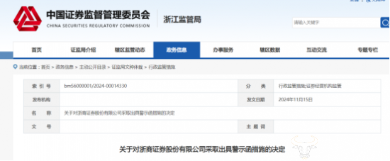 11月15日,浙江监管局发布对浙商证券采取出具警示函措施的决定。该决定显示,浙商证券在投资银行类业务中,主要存在两大方面问题。