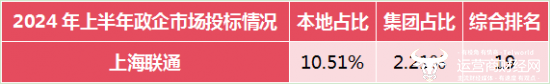 据悉,在今年上半年中,上海联通在政企市场的公开投标规模在当地的占比只有10%左右,这一占比显然不算高,很有垫底的可能。