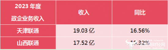 在政企业务上,天津联通2023年度实现收入为19.03亿元,同比增长为16.56%;