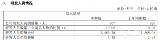 值得一提的是,根据今年上半年的财报,公司的研发人员由去年同期的929人降为今年的607人,减少了1/3,研发人员数量占总员工数量由19.28%下降至10.02%,平均薪酬由7.93万元下降到5.75万元。