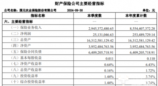 值得一提的是,据国元农业保险2024年第三季度偿付能力报告显示,在前三季度公司累计保险业务收入为85.54亿元,净利润达到2.53亿元。