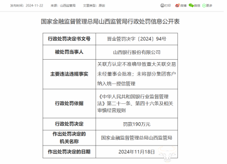 首先是,山西银行因“关联方认定不准确导致重大关联交易未经董事会批准;未将部分集团客户纳入统一授信管理”,被罚款190万元。