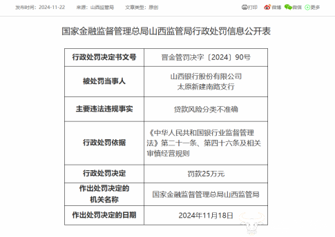 其次,山西银行太原新建南路支行因“贷款风险分类不准确”罚款25万元。同时,吕福海(时任山西银行太原新建南路支行客户经理)因对贷款风险分类不准确事项负有责任予以警告处分。